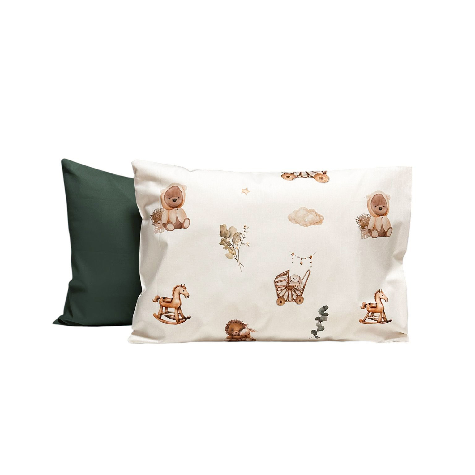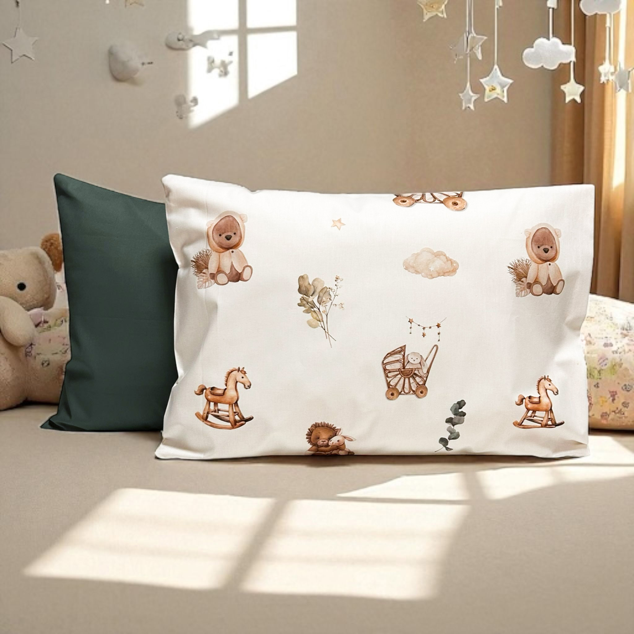 Set içerisinde bir adet desenli, bir adet düz renk yastık kılıfı bulunur. Birbirini tamamlayan tasarımıyla bebek odalarına zarif ve doğal bir dokunuş katar.